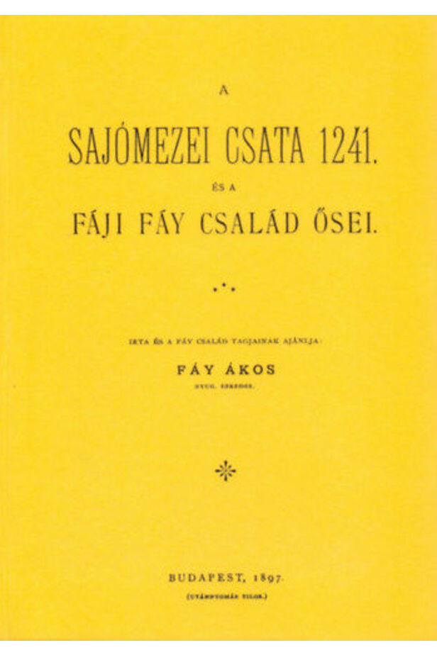 A kötet két részre osztható. Az első részben megismerkedhetünk az 1241 április 11-i sajómezei csata eseményeivel, amikor IV. Béla magyar király seregei megsemmisítő vereséget szenvedtek a tatároktól. A kötet második felében a szerző, Fáy Ákos családjának történetét olvashatjunk. A fáji Fáy család története IV. Bála idejére vezethető vissza, ekkor kapta a család őse adománylevelét. A kötetet egy melléklet egészíti ki, amelyben néhány oklevél átirata mellett a sajómezei csata rekonstrukcióját is találhatjuk. Írta és a Fáy család tagjainak ajánlja Fáy Ákos. Budapest : [s.n.], 1897.