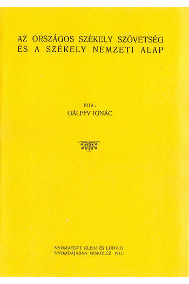 Az Országos Székely Szövetség és a Székely Nemzeti Alap azért jött létre, hogy a Székelyek ideológiai és kulturális megmaradását támogassa a románsággal szemben. Ideológiai és szervezeti bemutatását jelen kötetben Gálffy Ignác tollából olvashatjuk. – Miskolc : Klein és Ludwig Ny., 1913. Hasonmás kiadás.